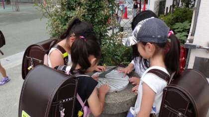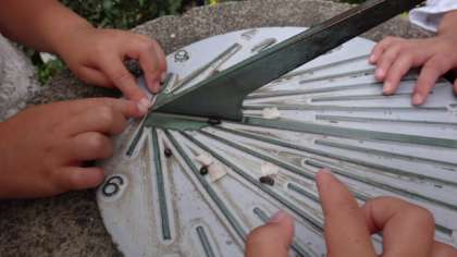 11日(木)朝、西門の方から登校してきた子どもたちが日時計の周りに集まっていました。何をしているのかのぞきこんでみると、そこにはダンゴムシが・・・日時計の金属プレートの溝を使ってダンゴムシレースです。発想に感心してしまいました。
