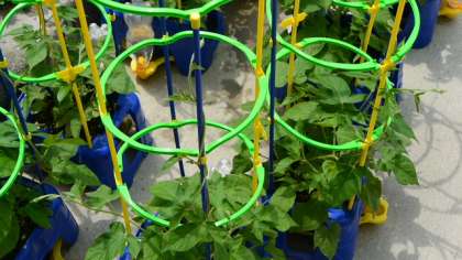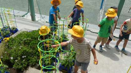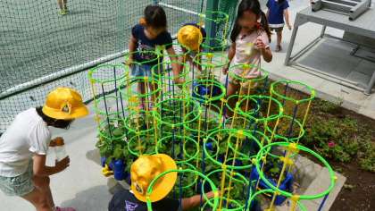 1年生が一人一鉢育てているアサガオ。こんなに伸びています。ツルをはわせるための枠もつけました。休み時間になると毎日欠かさず水やりに来て、自分のアサガオの成長ぶりを確かめては、感動の言葉を発している1年生の子どもたちです。