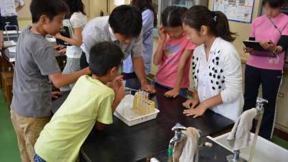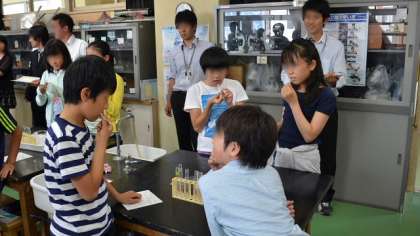 11日(木)午後、他の学級が下校した後、6年3組の理科研究授業を行いました。本年度から本校は理科・生活科の研究に取り組んでいますが、研究授業としては1回目となります。「人や動物の体」の学習で、主に内蔵の働きについて調べます。この日は、唾液の働きについて調べる学習です。口の中でご飯をかんでいると甘くなるのはなぜだろうかという問題から、それを確かめるための実験をしました。