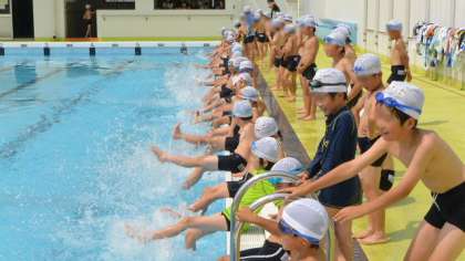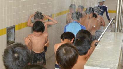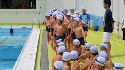 プールサイドが暑かったので、シャワーはいつもより気持ちよかったようです。バディで人数確認をしたあと、いよいよ水に入ります。