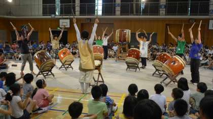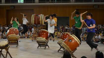 午後の部でも、教員の実演をさせてもらいました。子どもたちからの声援もわきあがります。それに応えた全力プレイ。ご覧の通りです。実演の後、「太鼓をたたいてとても気持ちよかった」という感想でした。太鼓や笛の音は人の気持ちを揺さぶる力をもっているようです。終わった後、高学年の子どもたちの顔にも満足感があふれていました。