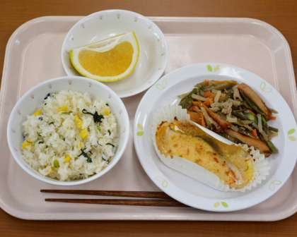 コーン茶めし 牛乳 魚のみそマヨ焼き くきわかめのきんぴら 河内晩柑