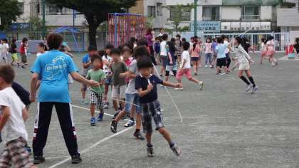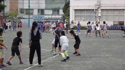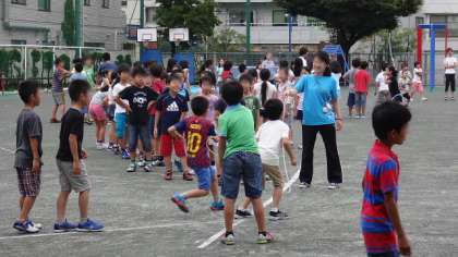 7日(火)、連日の雨で校庭が使えない日が続いたのですが、今日の午前中は雨がやんだので、校庭で3・4年生の体育朝会ができました。今日は長なわ跳びをしました。準備運動の後、さっそくクラスごとにわかれて跳びます。