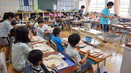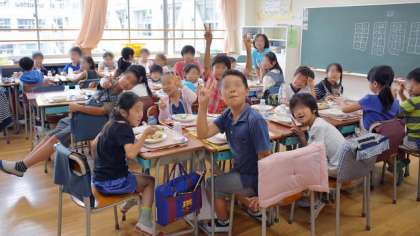 今年度になって、これまで毎月なかよし班遊びをしてきたので、会話もはずんでいました。また、いつもの給食とは違うメンバーで食べる給食は、楽しい会話もはずみ、また格別の味がするようです。どの教室をまわっても、ぺろりとたいらげている子が多かったのが印象的です。楽しい給食になりました。