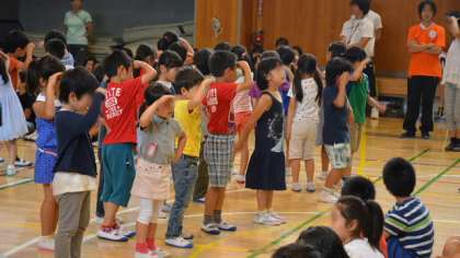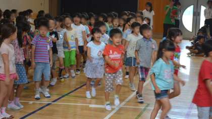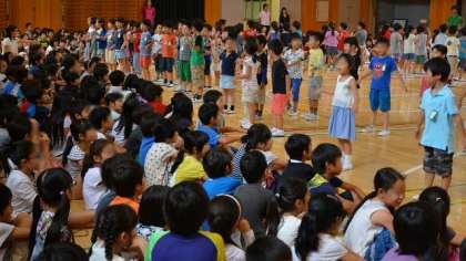 8日(水)音楽朝会は、1年生の歌の発表と、各学年の海にちなんだ歌の発表です。1年生はおなじみの「さんぽ」を歌いました。「あるこう あるこう」と元気よく行進しながら歌い始め、各学年がコの字に並んでいる前まで行って足踏みしながらかわいくてのびのびとした歌声を、振りも付けて披露してくれました。