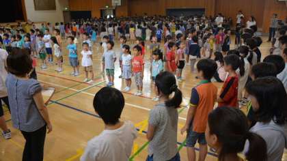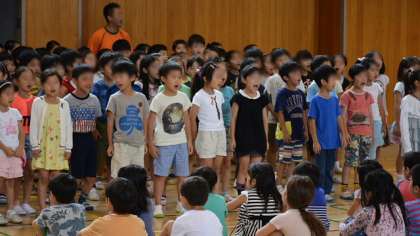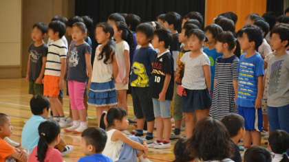 続いて各学年の海にちなんだ歌のメドレーです。1年生は「うみ」。2年生は「いるかはざんぶらこ」。3年生は「海風きって」を歌いました。各学年の個性が出て楽しい雰囲気になりました。