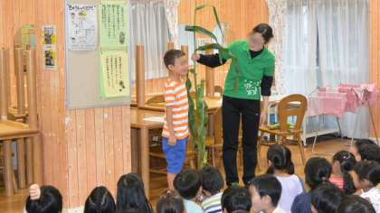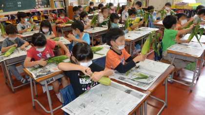 昨日に続き、2日連続の1年生の話題です。9日(木)、1年生が給食に使うトウモロコシの皮むきをしました。ランチルームに1年生が集まって、根までついたトウモロコシを見せて、その大きさやなり方について栄養士から説明を受けました。その後すぐ、よく手を洗い、教室で、軽く洗浄してある皮やひげがついたままのトウモロコシを一人1本ずつうけとり、一生懸命皮むきをしました。ていねいに皮むきして、おいしそうなトウモロコシがそろいました。