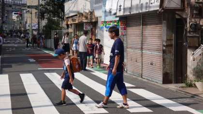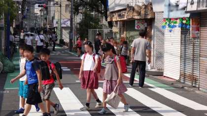 11日は土曜授業日です。西門前の通りは土曜日のため時間帯通行止めがされていないので自動車が通ります。そこで、地域の方と一緒に教員が分担して通りに立ち、児童の安全を見守っています。