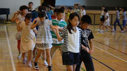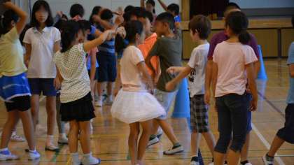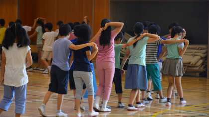 13日(月)、朝会の後、5年生は体育館に残って、9月早々に行われる移動教室のキャンプファイヤーで行う、フォークダンスの練習をしました。写真を見たらすぐわかりますね。そうです、定番の「オクラホマミキサー」です。最初はちょっと恥ずかしそうだった子どもたちですが、だんだんなれてきて楽しそうにおどっていました。準備にはちょっと気が早いようですが、9月9日から移動教室に行くので、決して早くはないのです。