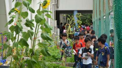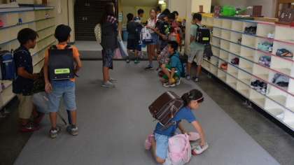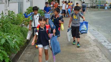 昼前、1学期の学校生活はすべて終了。たくさんの荷物と思い出を一緒にもって、家路につく子どもたちです。