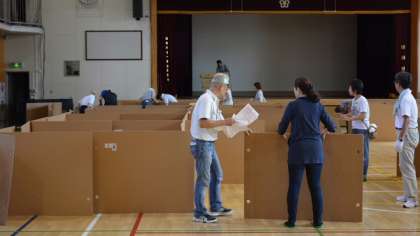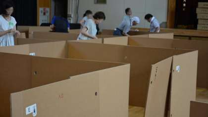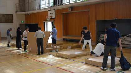 本校の避難所の特徴は、段ボール製のパーテーションが備えてあることです。保管庫から出し、まず体育館のなかに組み立てます。今晩はこの中で宿泊します。