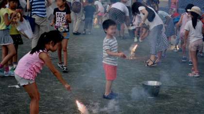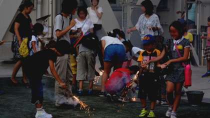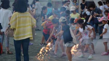 ここでちょっとお楽しみ。みんなで花火をしました。街中ではなかなか花火もしづらくなっています。広い校庭で、のびのびと花火を楽しみました。