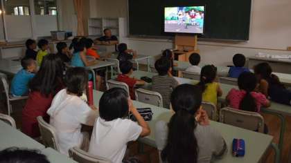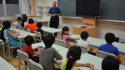 お楽しみの後はもう少しお勉強です。子どもと大人にわかれて、区の防災担当の方からのお話と、ビデオ教材を視聴して、防災の知識を身につけました。写真は子どものグループです。