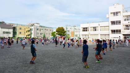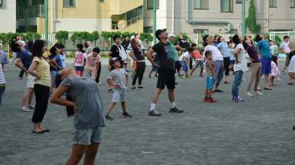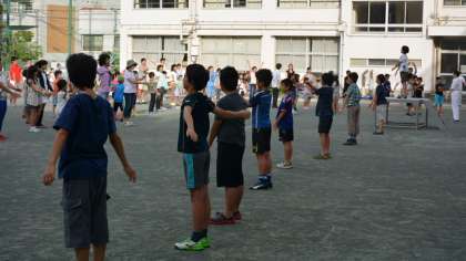 18日(土)朝から、町会主催のラジオ体操が始まりました。朝6時半、校庭に集まった本校児童や地域の方がラジオ体操をします。前に立つのはスポーツ少年団に属している子どもたちです。