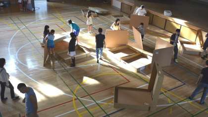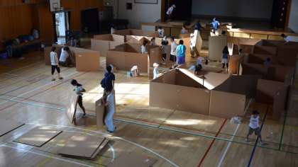 ラジオ体操に参加した後、一晩泊まった段ボールのパーテーションを、参加者みんなで片付けました。子どもたちも手伝って、短時間でできました。