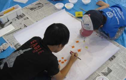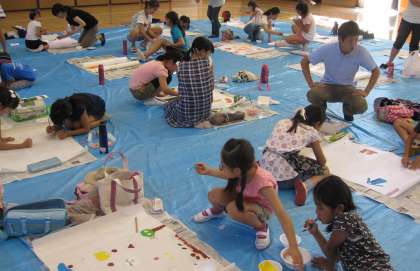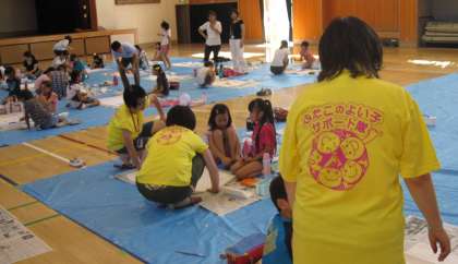 ふたこのよいこサポート隊が主催して、夏休みの4日間、サマースクールを開催しています。21日(火)は、「大山みちをいろどる 絵灯ろうを描こう!」です。暑い日中、体育館で秋をイメージして灯篭に絵を描きました。大山みちウイーク(10月下旬)の間、商店街に飾られる予定です。