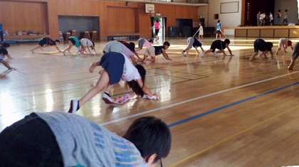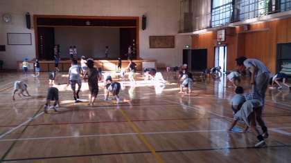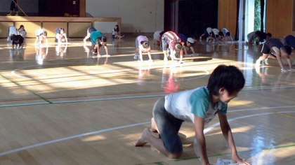 21日(火)朝、ラジオ体操の後、PTAの呼びかけで、体操に参加した子どもたちや保護者・家族の皆さんが体育館の清掃をしてくれました。普段なかなか行き届かない舞台裏側や体育館の床磨きなど、朝早くから一生懸命掃除をして、体育館がピカピカになりました。子どもたちが横一線でぞうきんがけするところは、壮観でした。