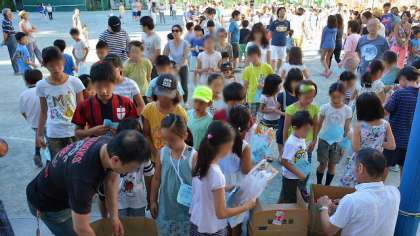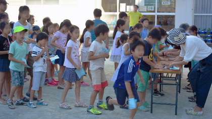 ラジオ体操の運営は、町会や商店街の皆さんがして下さっています。最終日とあって、出席者には参加賞が配られました。出席カードを見せて参加賞をもらった子は、とてもうれしそうでした。夏休み、これで早寝早起きの習慣がついたかな?
