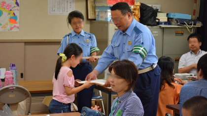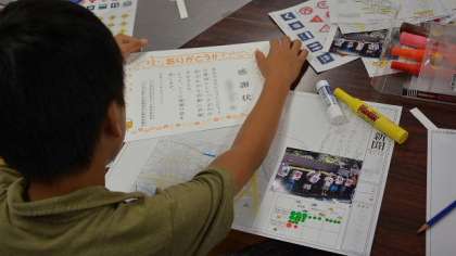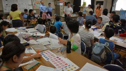 参加者には玉川警察署の方から感謝状が贈呈され、最後に今回のご指導をしてくださった大学の先生から、暑い中頑張った子どもたちに、おほめの言葉をいただきました。PTA校外委員、二子玉川地区交通環境浄化推進協議会、玉川警察署、玉川町会、日本大学、国士舘大学のみなさんにお世話になりました。(写真下:感謝状とできあがった新聞です)