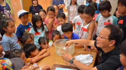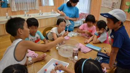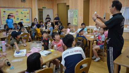 参加者が多いので、2グループに分けて多目的ルームではバルーンロケット作り、ランチルームでは「浮沈子」作りをしました。ランチルームでは、「浮沈子」の作り方(ちょっとコツがいるのです)について細かく説明した後、さあ製作実験に取りかかりました。