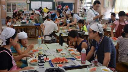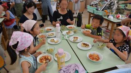 なんとか予定の時間で調理が終了し、グループごとに会食です。暑い中自分で作った料理の味は?・・・もちろん「おいしい!」。今日の経験を生かして、家でも料理に挑戦してみましょう。ご指導いただいた栄養士会の皆さん、企画、準備、お手伝いをして頂いたサポート隊の皆さん、ありがとうございました。