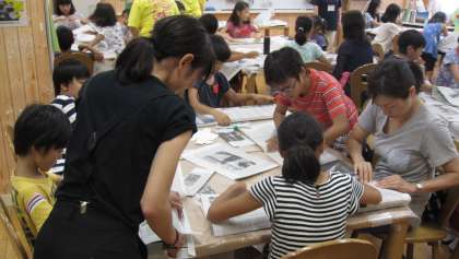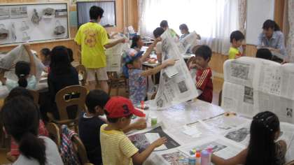 サマースクール4日目。最終日は「英字新聞でエコバッグをつくろう!」です。新聞紙1枚を、折って、のり付けして、エコバッグに変身させます。真剣な表情で熱心に作っている子どもたちの顔が印象的でした。お気に入りのバッグを仕上げることができました。ふたこのよいこサポート隊のみなさんには4日間、本当にお世話になりました。子どもたちにとっては夏休みの素敵な思い出になりました。