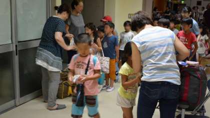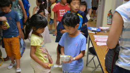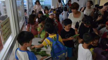 終了後、参加賞のお菓子をもらって大喜び。おまけに学校でとれたキュウリとゴーヤも持ち帰ってもらいました。
