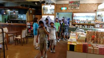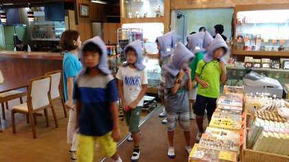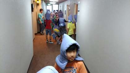 さっそく、避難訓練をしました。防災ずきんは宿の備え付けです。