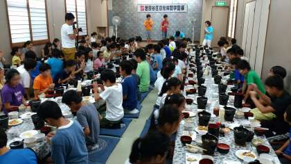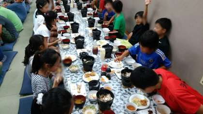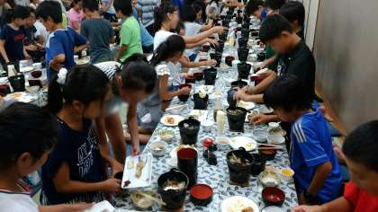食事係のあいさつで「ごちそうさまでした」。片付けもします。心配していた天候も回復し、この後はキャンプファイヤーです。