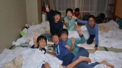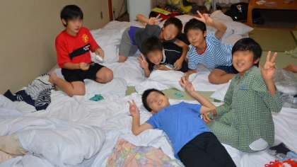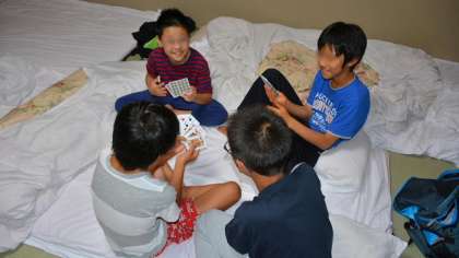 キャンプファイヤー後、お風呂に入って就寝時刻前のひととき、みんなで部屋でくつろぎました。