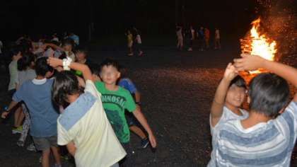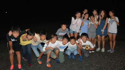 楽しいキャンプファイヤー! 支えてくれた担当の子どもたちが、最後に記念撮影をしました。みんな満足そうです。明日2日目も、楽しい林間学園になるよう願って・・・