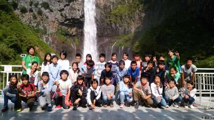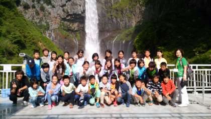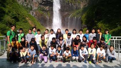 華厳の滝をバックに、水しぶきを感じながら各クラスで記念撮影。