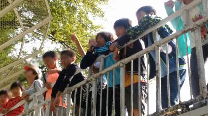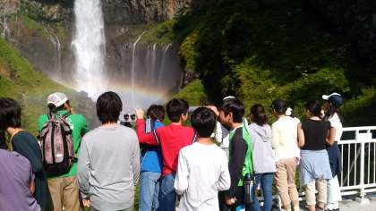 華厳の滝の雄大さ,美しさに見とれる子どもたちです。