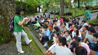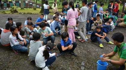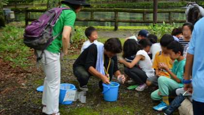 ハイキングの3分の1を短縮して、その分は遅れを取り戻すためもあって、バスを使いました。予定時刻に「さかなと森の観察園」に到着。水産庁の淡水魚の養魚場で、エサやりも体験できます。小さいカップに半分くらいエサを受け取りました。
