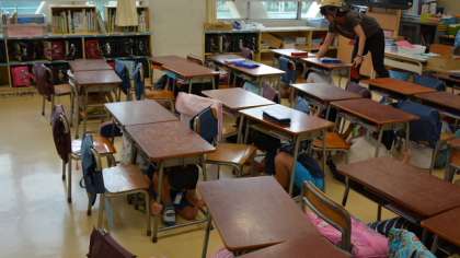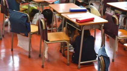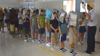 9月1日は防災の日です。今日は11時15分から避難訓練を行いました。大地震発生の想定で非常放送を行い、子どもたちは机の下に身を隠し、落下物に備える訓練をしました。その後安全な場所である校庭に避難をするのですが、今日は体育館に集合です。