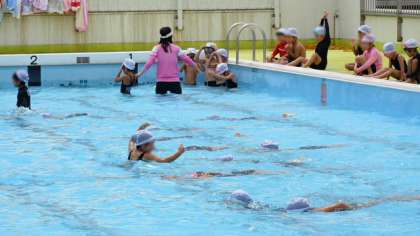 3日(木)、今日は1年生と2年生がプールで体育をしました。写真は1年生のようすです。水泳指導(低学年では「水遊び」)は、児童それぞれの経験に大きな違いがあり、授業としての指導が難しい面があります。スイミングスクール等で1年中泳いでいる子にとっては、学校プールは簡単すぎるかもしれませんが、まだまだ水を怖がる子や、浮かべない子もいますから、ていねいに指導しています。午前中は青空ものぞき、気持ちよさそうに活動できていました。