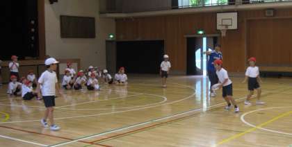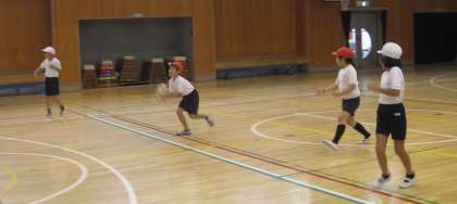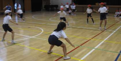 ゴール型ゲームの「タグラグビー」を学習しています。はじめに、ラグビー独特のパスの仕方を学びました。次に鬼遊びを通して、逃げたり、身をかわしたりする動きを身につけていきました。汗びっしょりになって、活動していました。