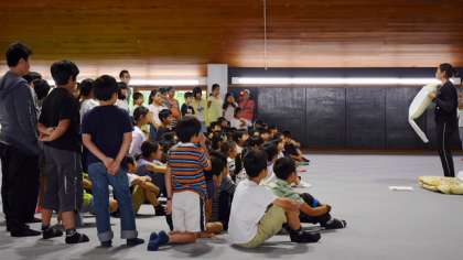 9日(水)、速報版が業務多忙のため、途中でストップしてしましました。改めて午後のようすをお伝えします。昼頃中部地方を横断していった台風18号の影響で、風雨が強くなった9日でしたが、川場村も断続的に雨が降る天候でした。そんななか、午後のスケジュールの最初は、「村の広場」でベテラン補助員さんから、布団のしきかたやシーツの取り扱いについてレクチャーです。ビレッジでのマナーとして大切です。みんな真剣に聞いていました。