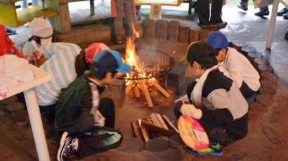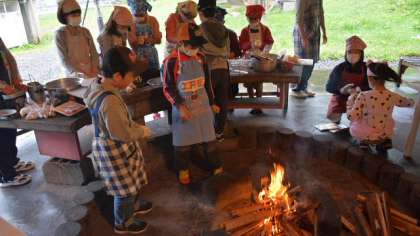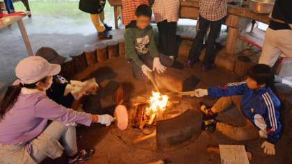 いよいよ各グループでカレーライスを作ります。雨が降り続いていたためか、まきが少ししめっていて、火をたくのも一苦労でしたが、煙で涙目になりながらがんばり、どの班も無事に火がつきました。