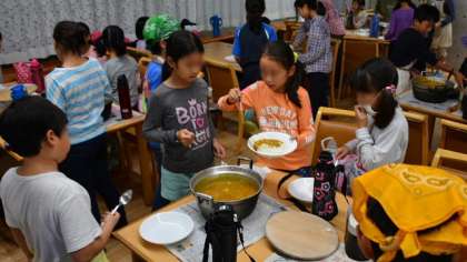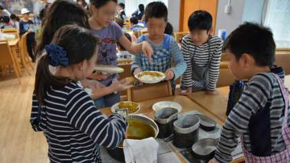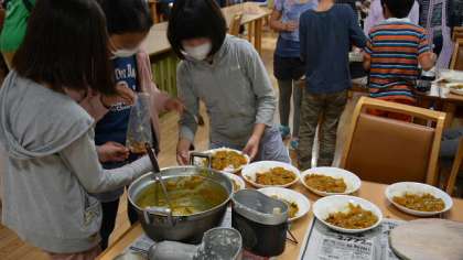 食堂で盛り付けです。手分けしてがんばりました。おいしそうなカレーの香りが食堂に漂います。