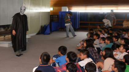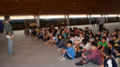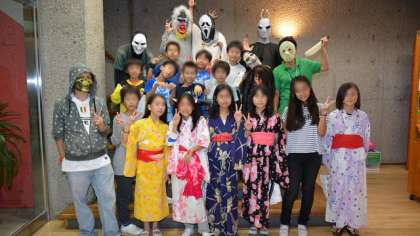 最後に体育館でこの後の日程の確認などを行いましたが、なぜかその場に宇宙人?!が。最後に肝試し係児童とお化けにふんした教員、補助員一緒に記念撮影をしました。こんなお化けが待ち受けていたのですね。