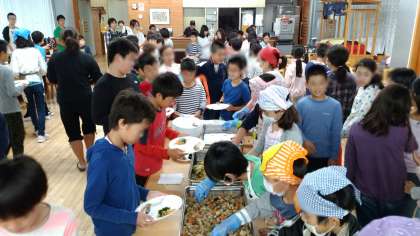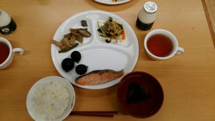 7時15分、みんなが食堂に集まってきて席につき、「いただきます」。朝食です。