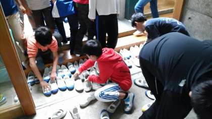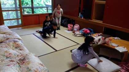 ごちそうさまをして、部屋に戻ります。整美係を中心に、部屋の片付けや簡単掃除、今日のハイキングの準備をします。
