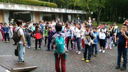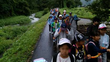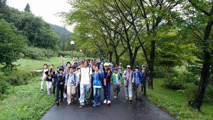 今日の午前中は、昨日まで大雨が降っていたので、登山道のコンディションが悪いということで「21世紀の森」登山をやめて、村めぐりをすることにしました。9時前にお祭り広場に集まり出発です。