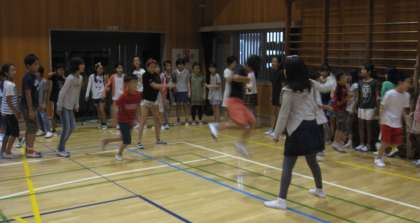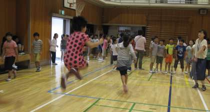 校庭は雨が降っていたので、体育館で長なわとびを行いました。クラスごとに声をかけ合いながら練習した後に、5分間で何回跳べるか競争しました。リズミカルにタイミング良く跳べるようになってきました。一番記録がよかったクラスは大喜びでした。