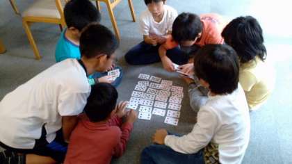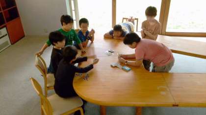 午後はマスつかみをして、捕まえたマスを塩焼きにして食べる予定でしたが、台風の影響で川の水が増して、川の水をひいてマスつかみをする池の、水位の水量調整ができない状態になっているということで、中止になりました。楽しみにしていた子も多いので残念です。代わりに、午後2時から村の会堂でレクリエーション大会をすることにしました。それまでの時間、各自が工夫してすごすことになりました。たいていの班が、持参したカードゲームなどで遊んで、楽しそうにすごしていました。