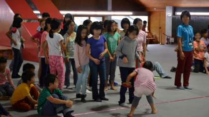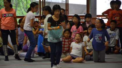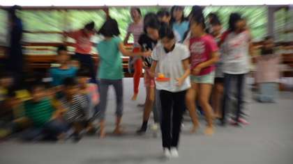 続いての種目は「ピンポン球運びリレー」。卓球のラケットにピンポン球をのせて、落とさないようにリレーします。最初は女子です。たいらな卓球のラケットですから、ピンポン球を落とさないようにするにはバランス感覚と工夫が必要です。