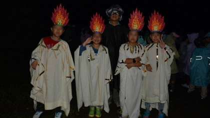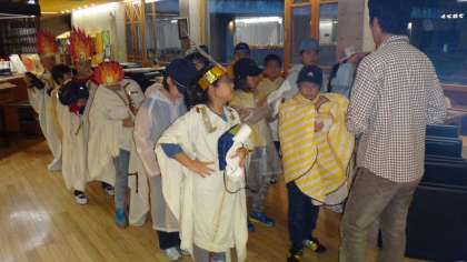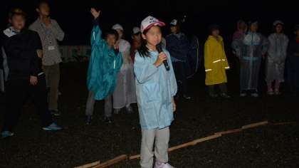 昨日予定していたキャンプファイヤーを延期して今日実施することにしていたのですが、夕食の間ずっと雨が降り続き、空の雲のようすをにらみつつ判断に迷いました。衛生雲画像を見たり、雲の動きを見て、最終判断を30分先延ばしにしました。最終決断の6時少し前、まだ小雨がぱらついていましたがレインコート持参で実施を決定しました。午後6時、キャンプファイヤー係がロビーに集合して、みんなより一足早く現地入りし、準備をします。6時半、幸運の女神はほほえみました。雨もやんで6時半開始できました。
