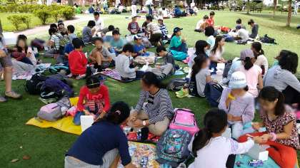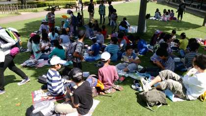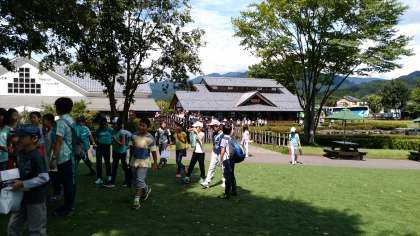 さらに予定を変更して、昼食を田園プラザで食べることにしました。人工芝の上でおいしい食事です。
