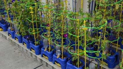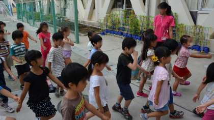 朝会終了後、行進曲に合わせてしっかり行進する1年生。その後ろにアサガオの鉢が見えます。夏休み中家に持ち帰っていた一人一鉢のアサガオを、保護者の皆さんの協力で学校に戻してもらいました。天候のせいでしょうか、この時期だというのにまだ葉がしげり、花も咲いています。生活科の学習で、アサガオの種とりと、ツルを使ったリース作りを予定しているのですが、今年は枯れるまで時間がかかりそうです。